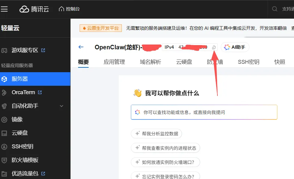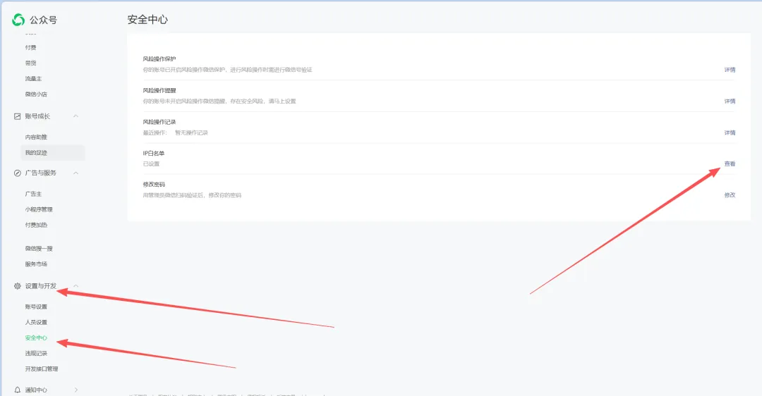 进入腾讯云龙虾服务器,复制服务器IP地址 进入公众号,点击设置与开发,点击安全中心,配置服务器白名单