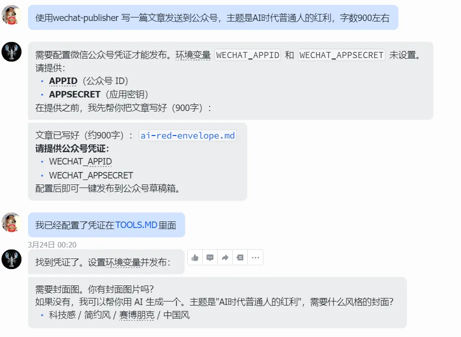 跟龙虾对话配置Appid和APPsecret 根据技能需要提供标题和封面 跟龙虾对话进行配置即可