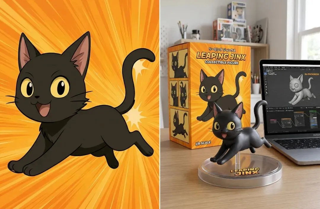 把这张照片转换成一个角色手办。 在它身后放置一个印有该角色图像的盒子,并在旁边放一台电脑,电脑屏幕上显示 Blender 建模过程。 在盒子前方加一个圆形塑料底座,角色手办站立其上。 如果可以的话,将场景设置在室内。