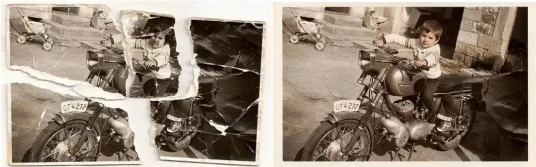 移除所有老旧损伤痕迹:划痕、瑕疵、褪色与霉斑,修复并自然着色此图像。精细还原人物五官并增强细节,保持画面干净柔和,避免过度锐化。