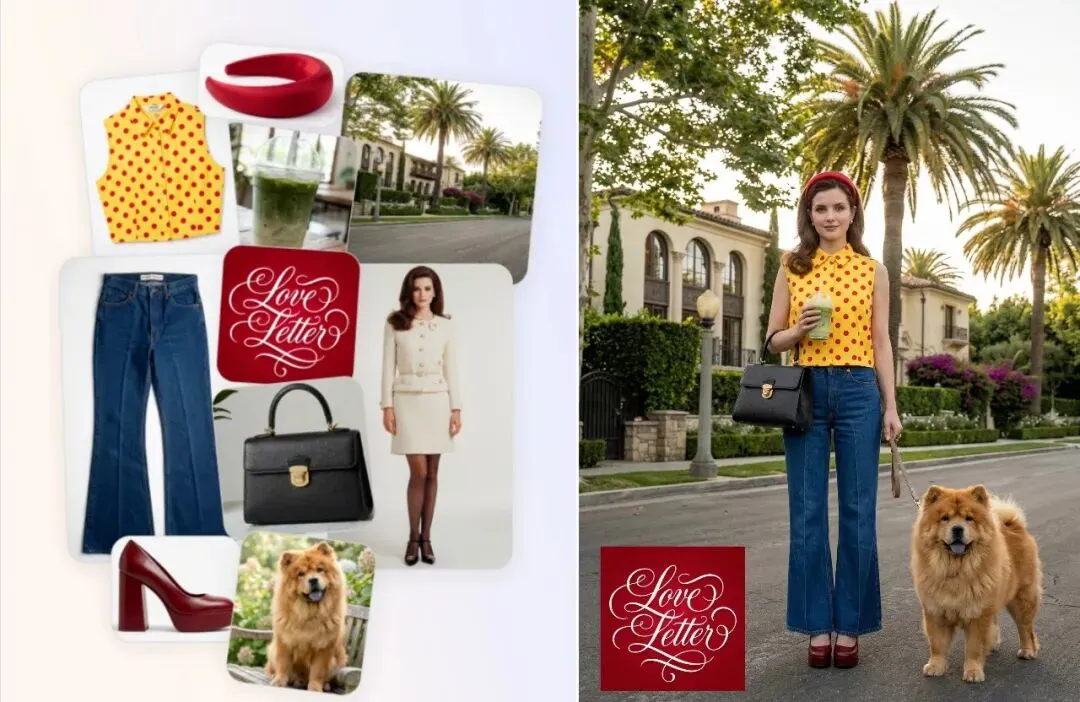 图中的模特站在图中的场景里,右手牵着图中的狗,图中的衣物替换到模特身上,挎着图中的包,左手拿着图中的饮料,图中的文字在左下角