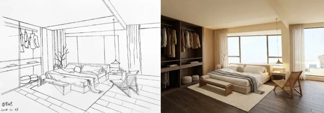 请为这张黑白线稿进行上色,配上合适的背景,变成一张装修效果图
