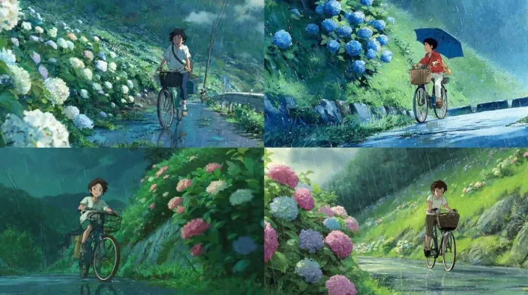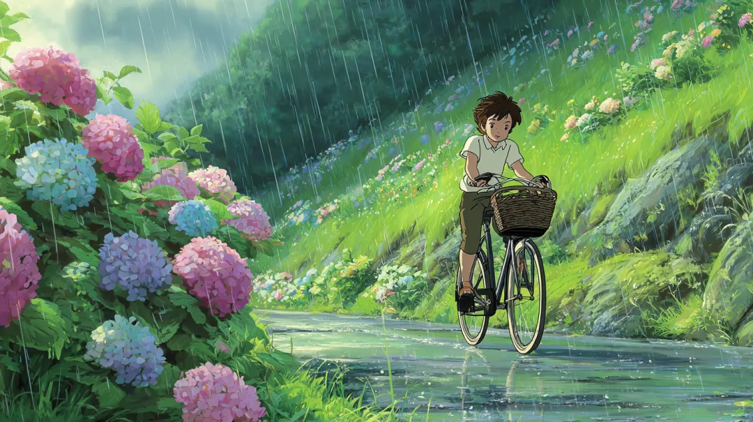 一个男孩在雨后骑车穿过开满绣球花的山坡,湿润的道路倒映着阴天,整体是清新的绿色调,带有惆怅感的日系动画电影氛围,动态轻盈,背景绘制细腻。