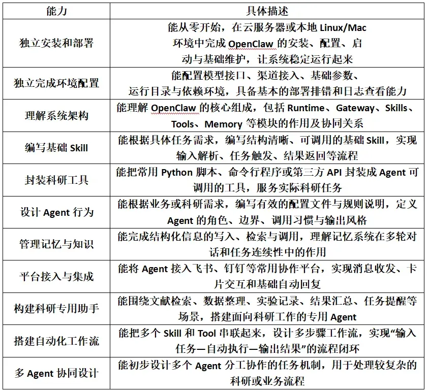 课程目标并不止于“安装并运行一个智能体系统”,而是帮助学员真正理解并掌握:如何将OpenClaw构建为科研工作的统一入口、知识中枢、任务调度器与协作助手,使其能够服务于文献获取与整理、科研知识管理、蛋白–配体项目支持、计算任务辅助、实验/计算流程串联、组会材料生成以及飞书协同等实际科研工作。