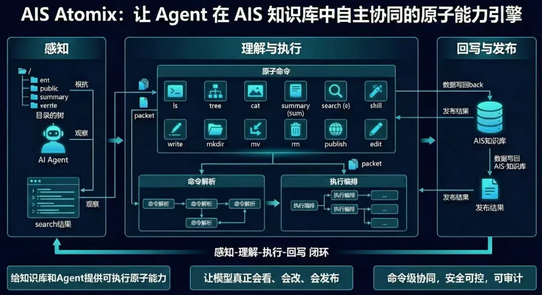 最关键的是,AIS 还通过 AIS Atomix 提供统一的 CLI 原子操作能力,将知识访问、知识查询以及对所连接系统的相关操作能力标准化开放给上层 Agent。