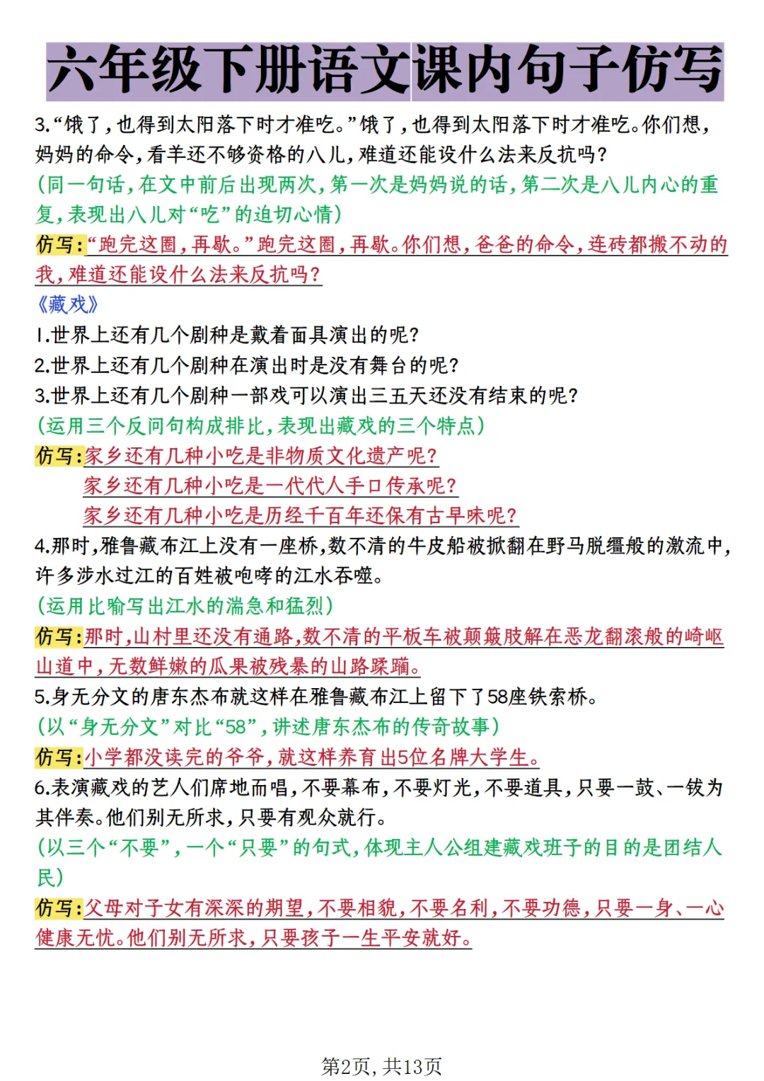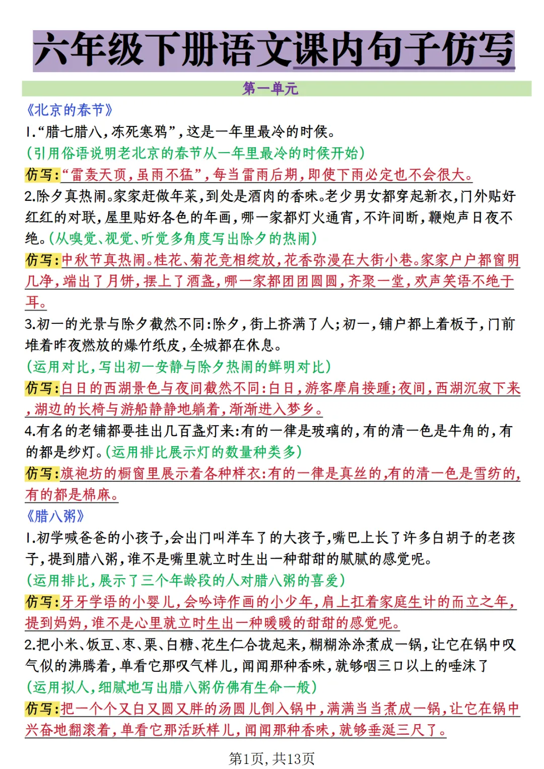 六年级(下)语文 课内句子仿写