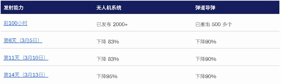 伊朗的发射活动:伊朗的无人机和导弹发射在最初四天后迅速下降。尽管此后略有回升,但这些发射活动仍远低于此前的大规模齐射。然而,其“残余发射能力”仍在持续造成破坏,尤其对能源设施造成破坏。