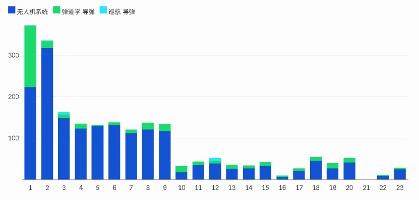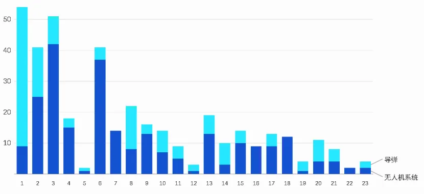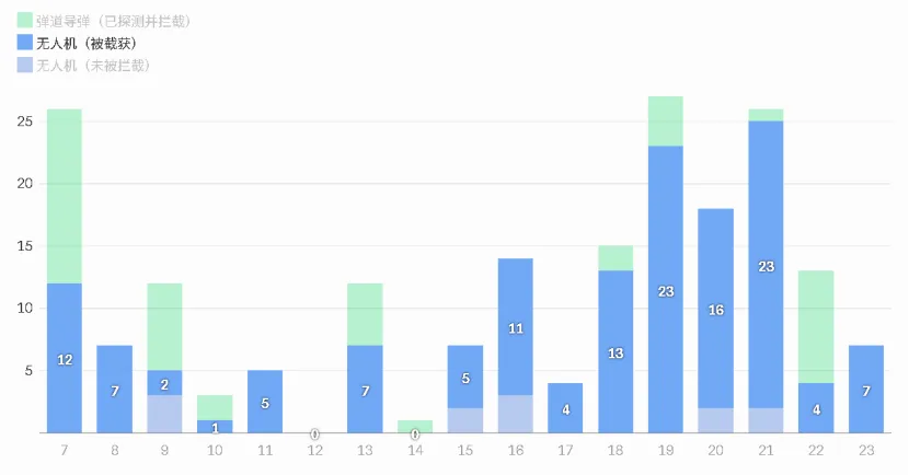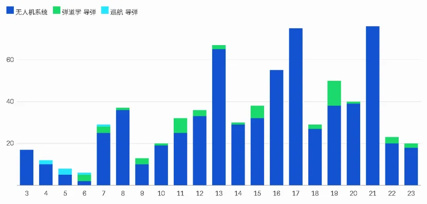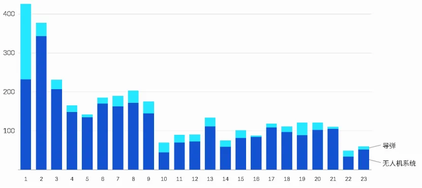 图 3:巴赫拉尼报告的无人机和导弹拦截情况,第 1-23 天