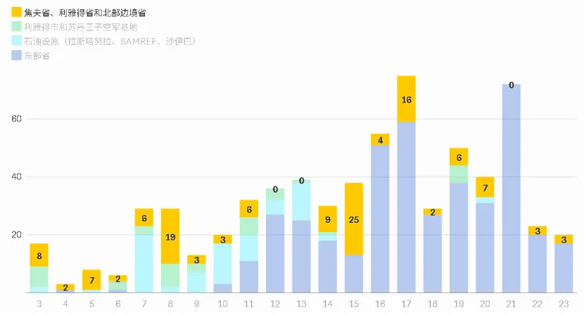 注:不包括报告称在“沙特领空”拦截的45枚导弹和无人机。为便于阅读,地点已进行分组。例如,在哈尔吉省拦截的无人机被归类为利雅得省。