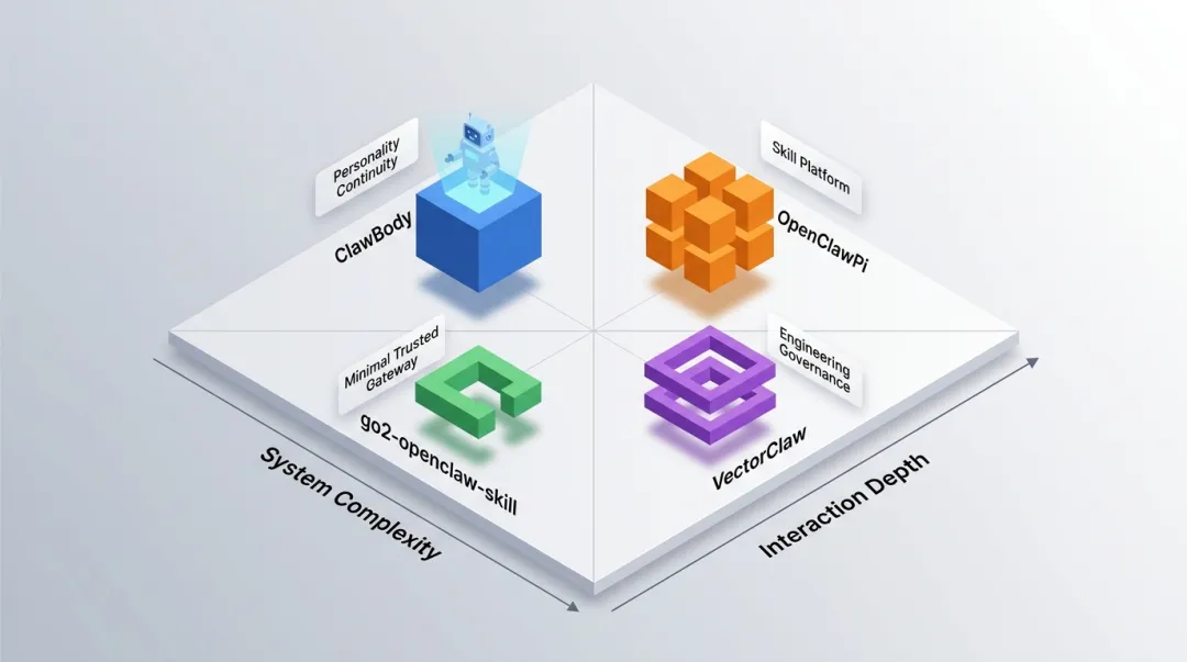 你会看到,这四个项目都在做同一件事:把 OpenClaw 从聊天界面带到真实机器人里。不同的是,它们分别选择了不同的工程路径。