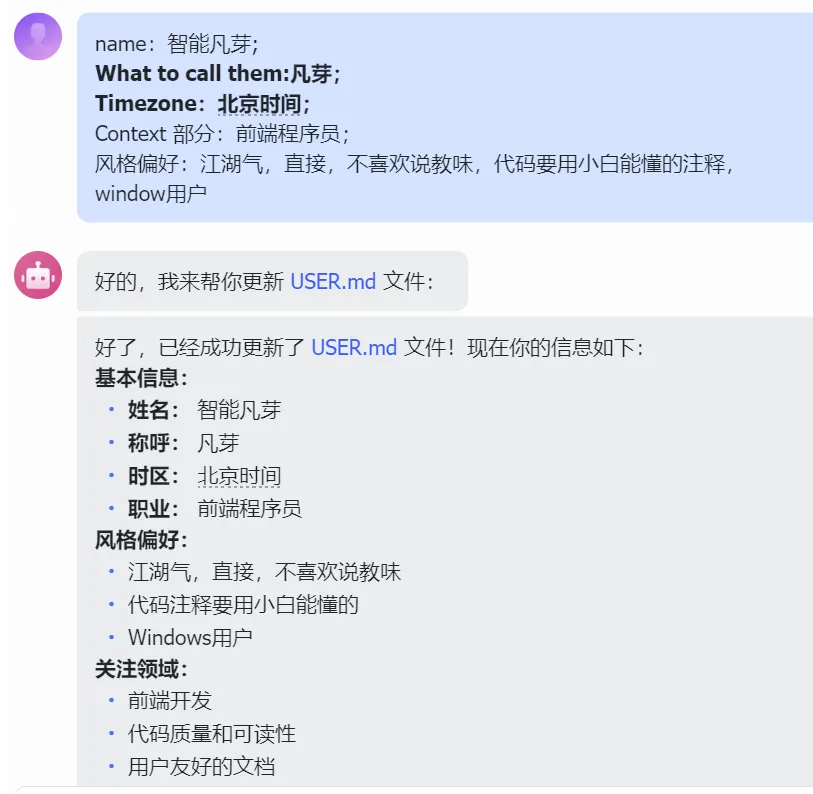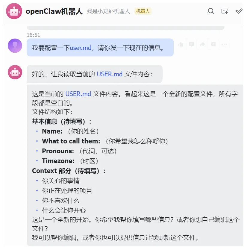 比如:跟它说:“我要配置一下user.md,请你发一下现在的信息。”
