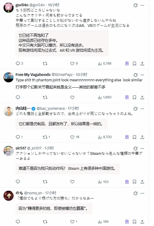 日本博主@kyabetsuhuman在转发该实机演示时直言:“质量确实很高,但最近的中国游戏外表看起来实在太雷同了。”