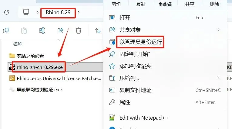 2.进入解压后的【Rhino 8.29】文件夹,选择【Rhino_zh-cn_8.29.exe】,右键,选择【以管理员身份运行】。