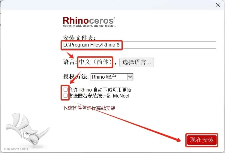 4.修改安装路径,教程是改为D盘,语言勾选【中文(简体)】,取消勾选【允许 Rhino...】和【发送匿名...】,点击【现在安装】。