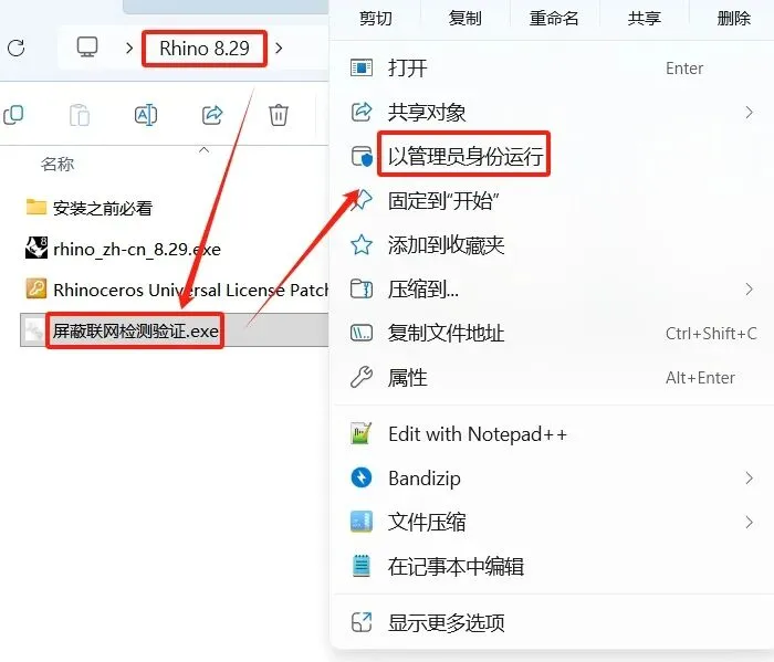 7.进入解压后的【Rhino 8.29】文件夹,选择【屏蔽联网检测验证.exe】,右键,选择【以管理员身份运行】。