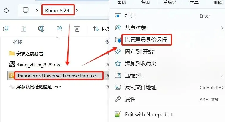 8.进入解压后的【Rhino 8.29】文件夹,选择【Rhinoceros_Universal_License_patch.exe】,右键,选择【以管理员身份运行】。