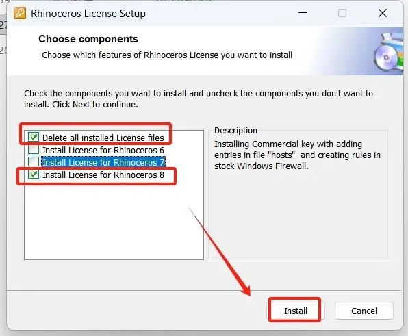 9.选择【Delete ...】和【Install License for Rhinoceros 8】,点击【Install】。