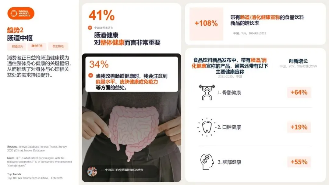这份报告结合全球视野与本土消费特征,从原料、功能、体验、场景、市场结构及可持续发展等维度,梳理2026年行业核心发展方向。当前市场呈现功能化、场景化、品质化与本土化并行特征,全能蛋白、肠道健康、情绪悦享、功能饮品、健康老龄化、细分场景、下沉市场、心理关怀、传统创新与可持续落地构成十大核心趋势。消费者健康需求从基础营养延伸至身心协同,蛋白质与肠道健康相关新品增速显著;纵享体验向多重感官与情绪价值升级,饮品功能化与减糖成为主流;老龄化进程推动健康养老产品快速增长,一人食与家庭场景驱动便捷化创新;低线城市成为增长核心,本土传统与异域文化融合创新受青睐,可持续理念从概念转向务实落地。上述趋势全面反映行业从产品驱动转向需求驱动,为产业创新与市场布局提供客观参考依据。