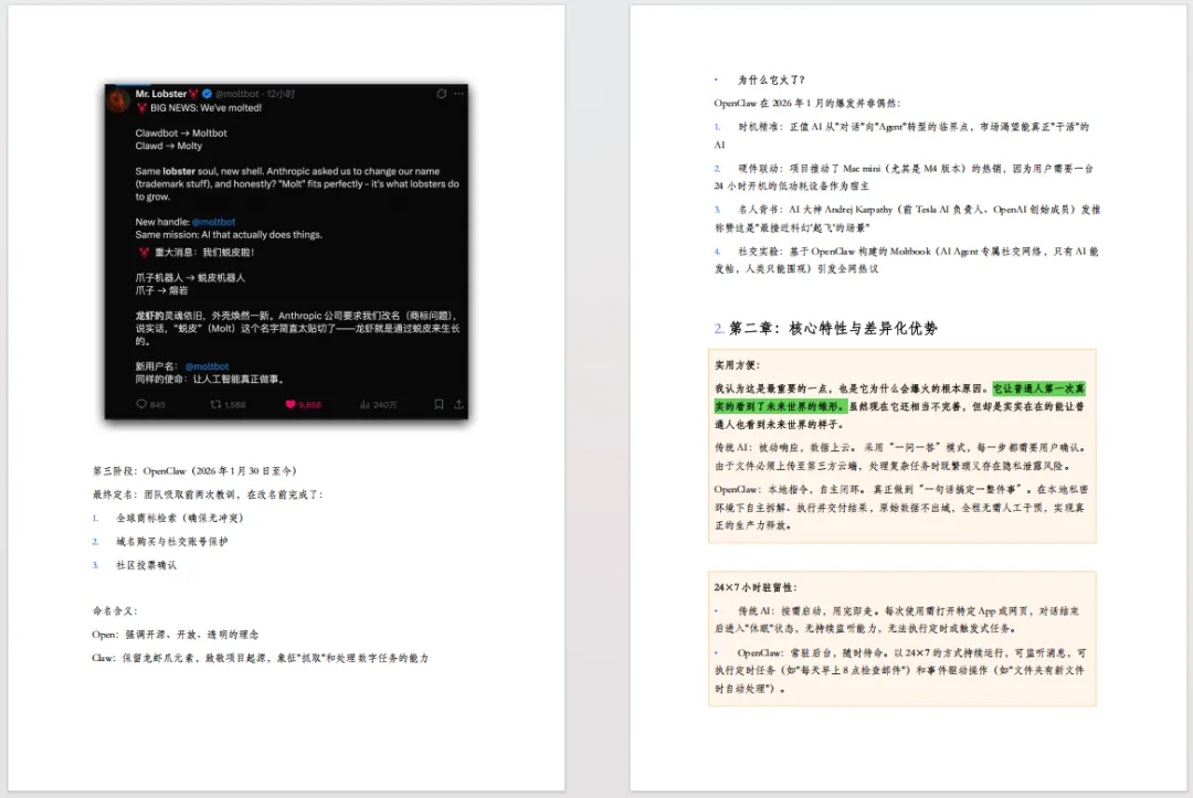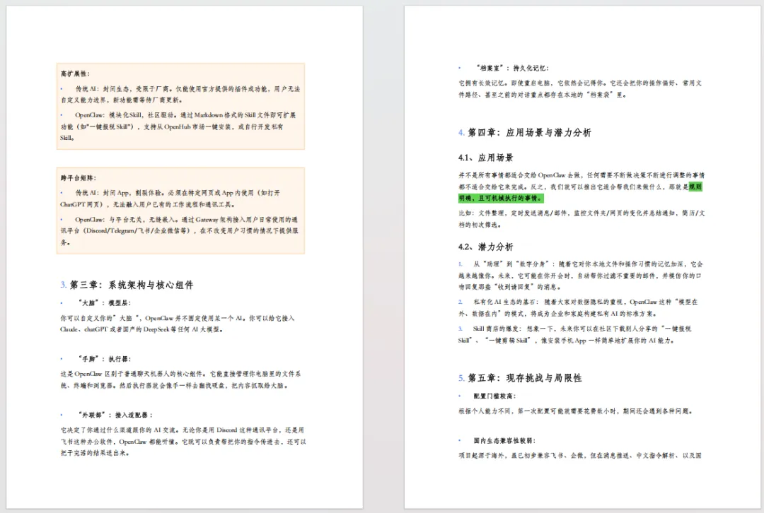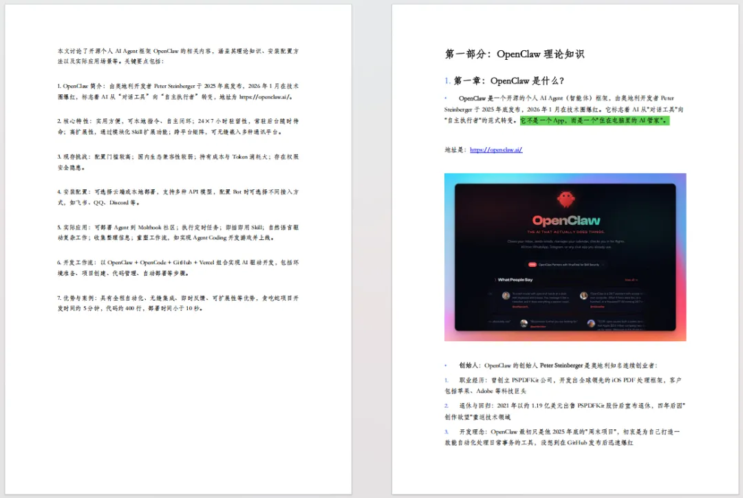 理论知识:系统介绍了OpenClaw的起源、核心特性(如本地指令、24/7驻留、高扩展性、跨平台能力)、系统架构(大脑、手脚、外联部、档案室)以及其适用的场景(规则明确、可机械执行的任务)与潜在挑战(配置门槛、成本、安全风险)。
