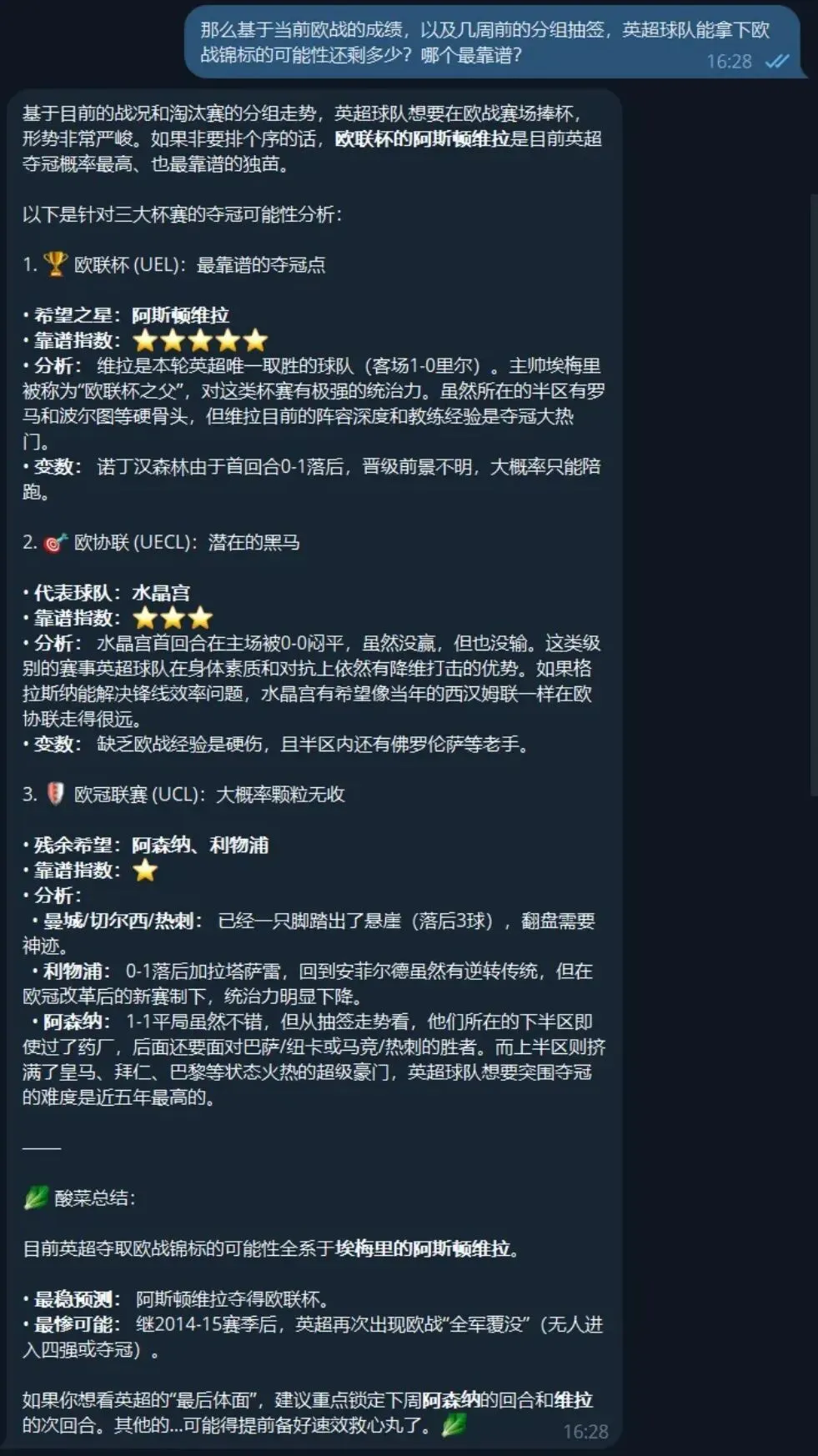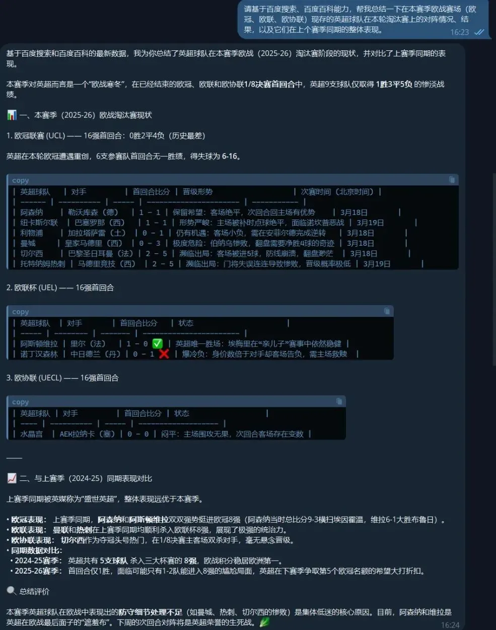 现在不用了,只要给百度搜索Skill的智能体发一句“本赛季欧战英超球队最新战况”,它立马就能调取最新赛果,同步球队过往表现,甚至还能简单分析夺冠概率,不用手动翻,想看的内容一眼get,简直是球迷福音。
