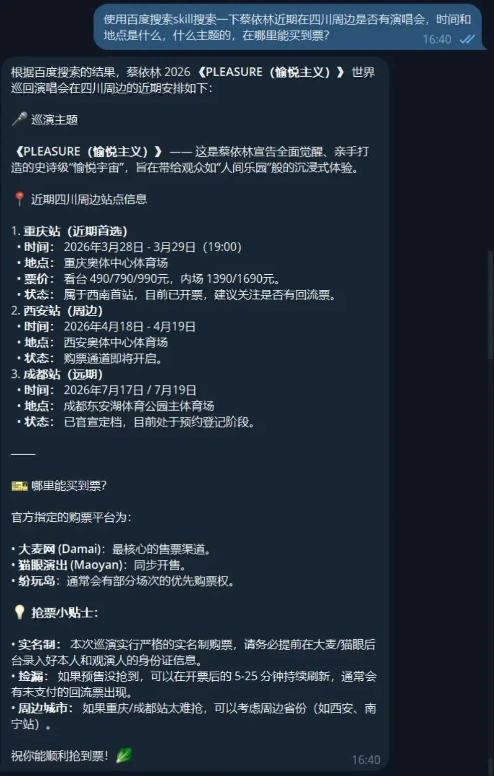 第三个,日常琐事救星,全方位覆盖!不管是想查明星演唱会的门票时间、地点,只要跟智能体说一声,它都能通过百度搜索Skill快速找到精准答案。