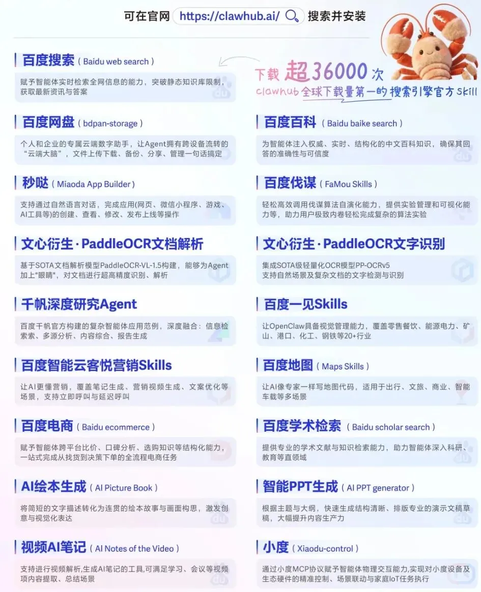其中最戳我的,就是百度搜索Skill,不是华而不实的花架子,是实打实能帮咱们解决日常琐事+办公的神器,现在它在ClawHub下载榜稳居第一,据了解很多用过的人基本都被圈粉了。