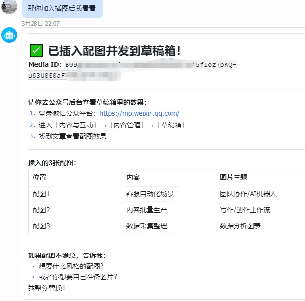就像现在我想偷懒发公众号文章,我就直接跟小龙虾说,帮我找选题,选题找好后,我选择一个后,帮我直接出大纲,出文案,加配图,写标题,然后直接写完后给发到公众号草稿箱,我看一眼没问题后直接发布。