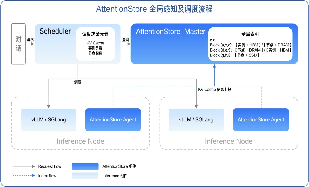 在实际生产环境中,推理请求往往运行在多节点、多实例的分布式架构之上。若推理调度器对缓存分布无感知,仅依据不同实例的状态及负载等因素进行调度决策,极易出现「请求被调度至无缓存节点」的情况,从而触发完整的 Prefill 重算,使得 Offload 带来的性能收益被完全抵消。