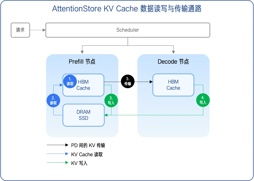 Prefill 节点生成的 KV 传输至 Decode 节点,并异步回写至主机内存 / SSD;