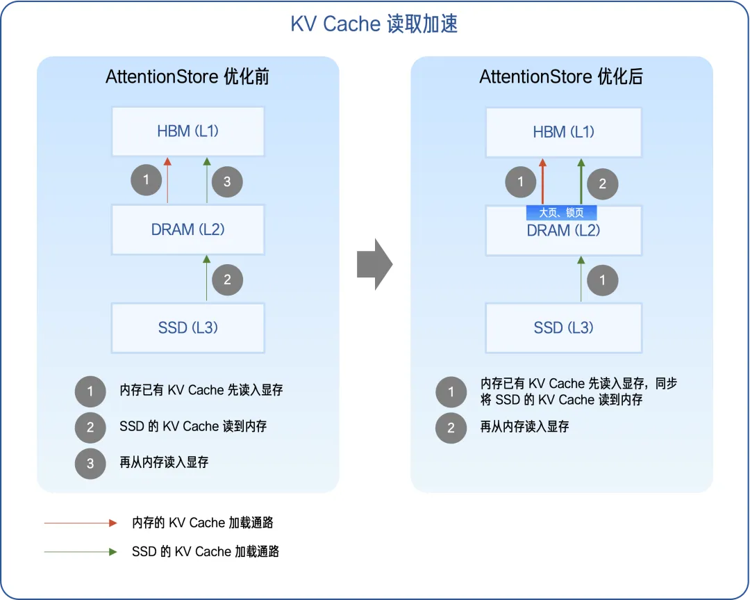 KV Cache 读取加速:在 HBM、DRAM 与 SSD 混合命中的场景下,传统的 KV Cache 读取采用串行逻辑(如下图左侧「AttentionStore 优化前」所示),这种方式的读取耗时较长。对此,我们通过将 KV Cache 的读取过程拆分为并行任务 —— 让高速介质与低速介质同步发起传输(如下图右侧「AttentionStore 优化后」所示),最大程度缩短全部 KV Cache 的读取耗时。此外,我们将 AttentionStore 管理的共享内存标记为大页内存,显著减少页表项数量,降低地址转换开销,提高内存访问效率;同时,通过全生命周期锁页操作,避免 KV Cache 数据在传输过程中被换出,减少额外的内存拷贝与页错误开销,使数据能够以更稳定、更高带宽的方式直达显存。实测显示,DRAM 到 HBM 的通信效率较基线提升了 4 倍,让 DRAM 与 SSD 中的缓存数据能够更快进入显存参与计算;