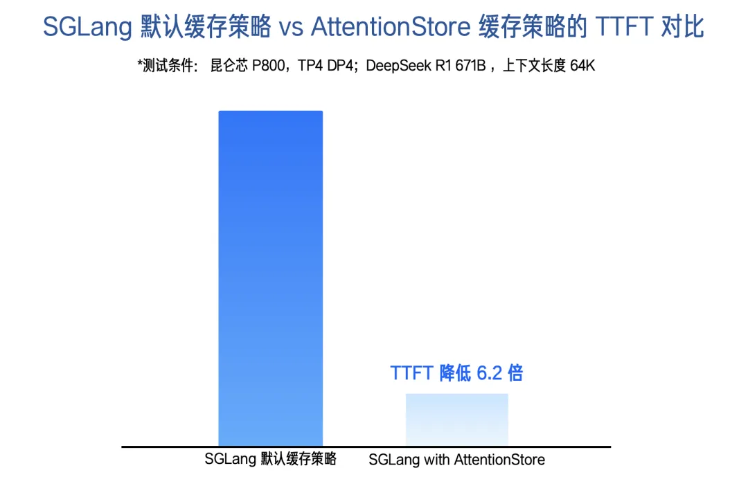 百度百舸推出了一套自主研发的 KV Cache 系统 —— AttentionStore,并基于昆仑芯 P800 在 DeepSeek 模型上完成系统验证:在 8K+ 长上下文场景中,TTFT 实现了 2 至 5 倍的性能提升;而在 64K 长上下文场景下,TTFT 性能提升至 6.2 倍,显著增强了大模型在长上下文历史条件下的首 Token 响应能力。