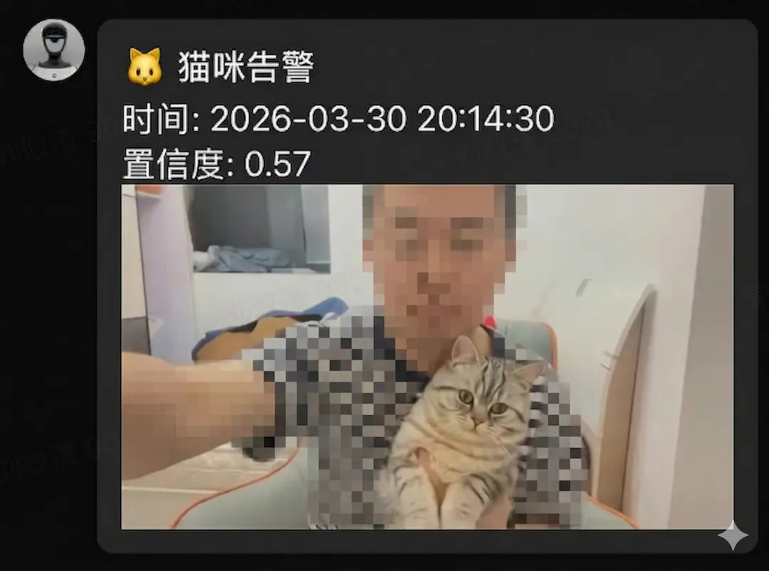 这套系统的核心价值在于:低延迟 + 本地隐私 + 全自动化。从猫咪入镜到飞书收到告警,延迟控制在 2s 以内,视频流完全不经过第三方服务器。