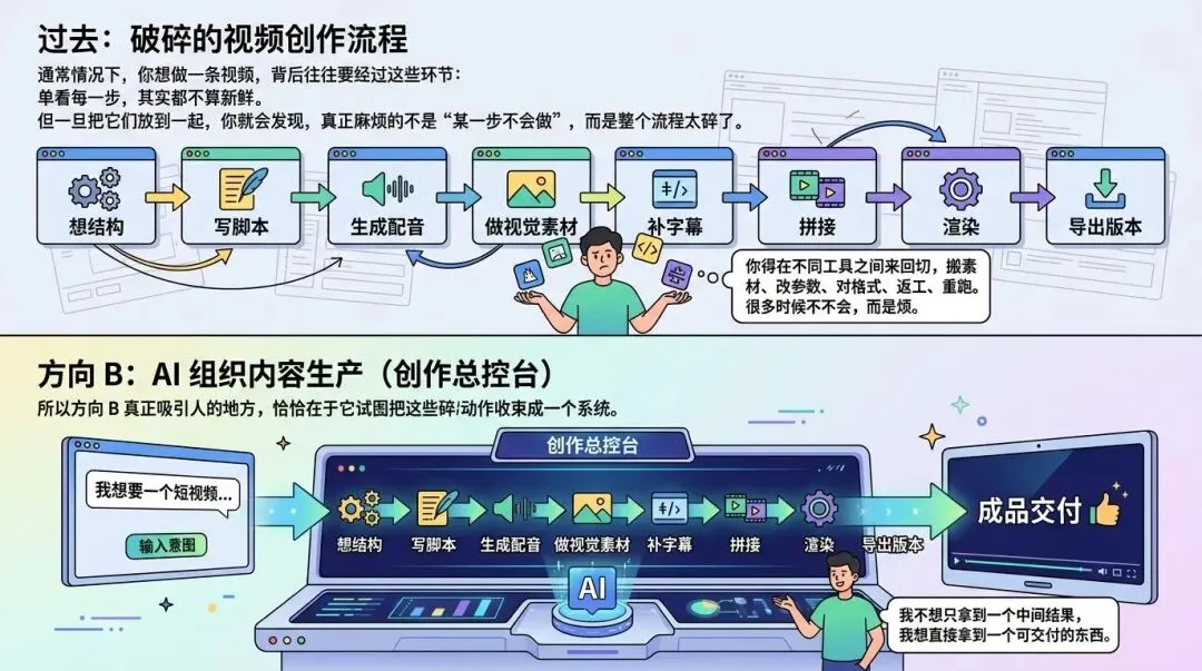 所以从根子上说,方向 B 不是“内容自动生成”,而是创作流程工程化。