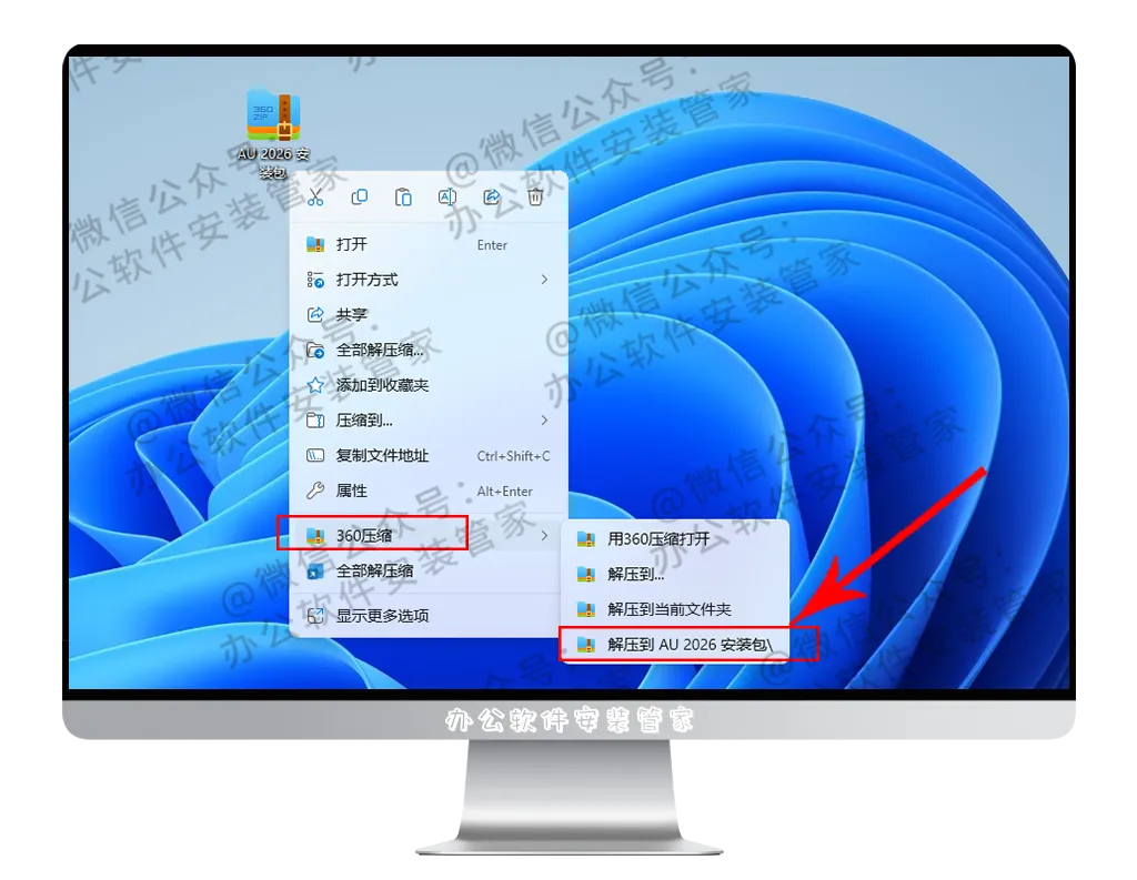 1.找到并选择已下载好的 【AU 2026 安装包】 压缩包并进行解压