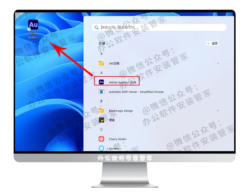 11.找到AU2026后左键单击选择,拖拽至桌面生成快捷启动方式