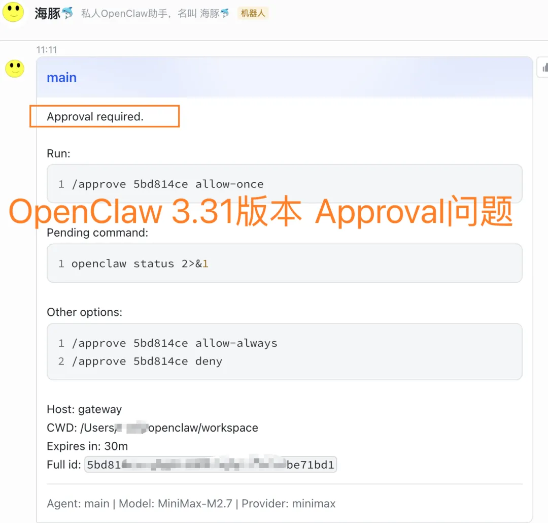 升级到 OpenClaw 3.31(2026.3.31)后,很多用户遇到终端突然弹出:Approval required.