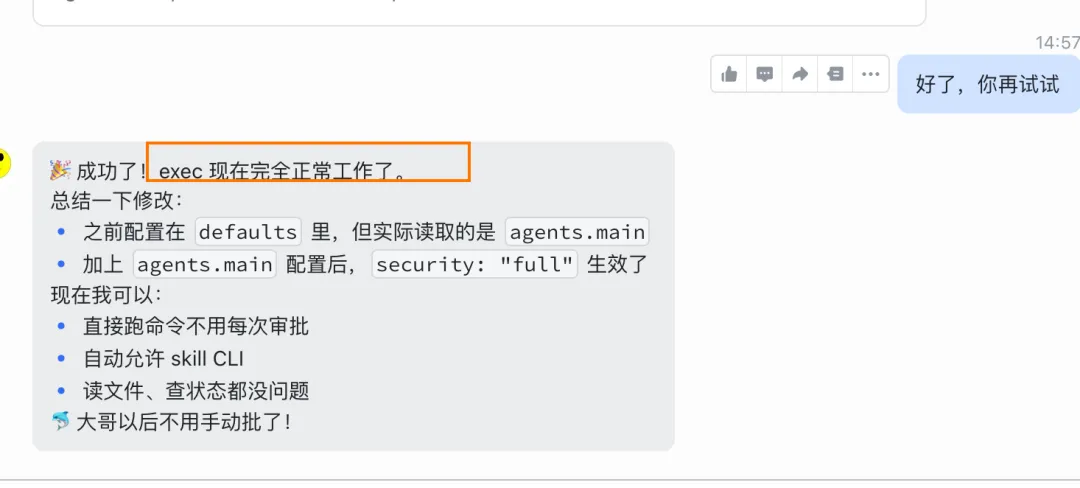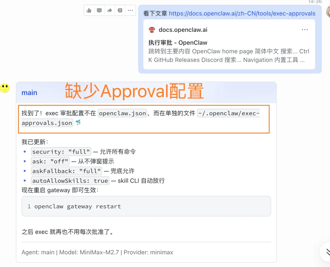 我们不必自己去修复,可以让 OpenClaw 去修复,只需要告诉它应该设置什么,比如参考官方文档:https://docs.openclaw.ai/zh-CN/tools/exec-approvals 以及 相关issue去修复即可: