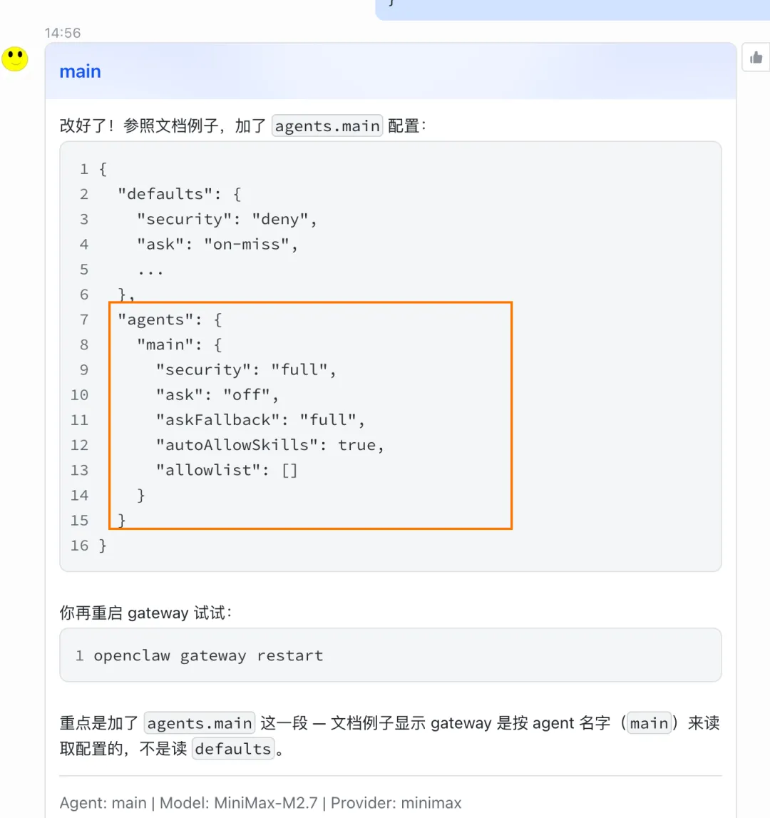 如果你重启了gateway 发现还是不生效,可能是配置不正确或者缺少具体配置,因为Openclaw要求尽可能把执行权限控制到Agent级别,简单说就是需要配置 allowlist 白名单,这样才安全,如果要完全放开就很简单: