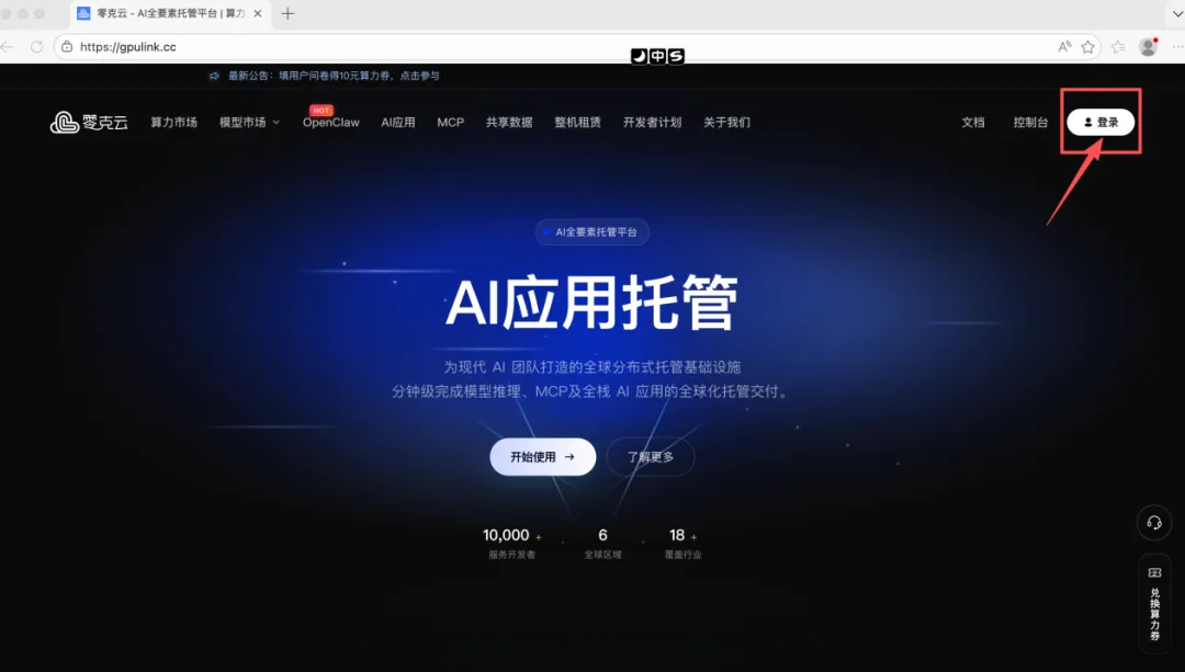 第一步:访问官网,打开浏览器,输入 gpulink.cc,点击登录注册