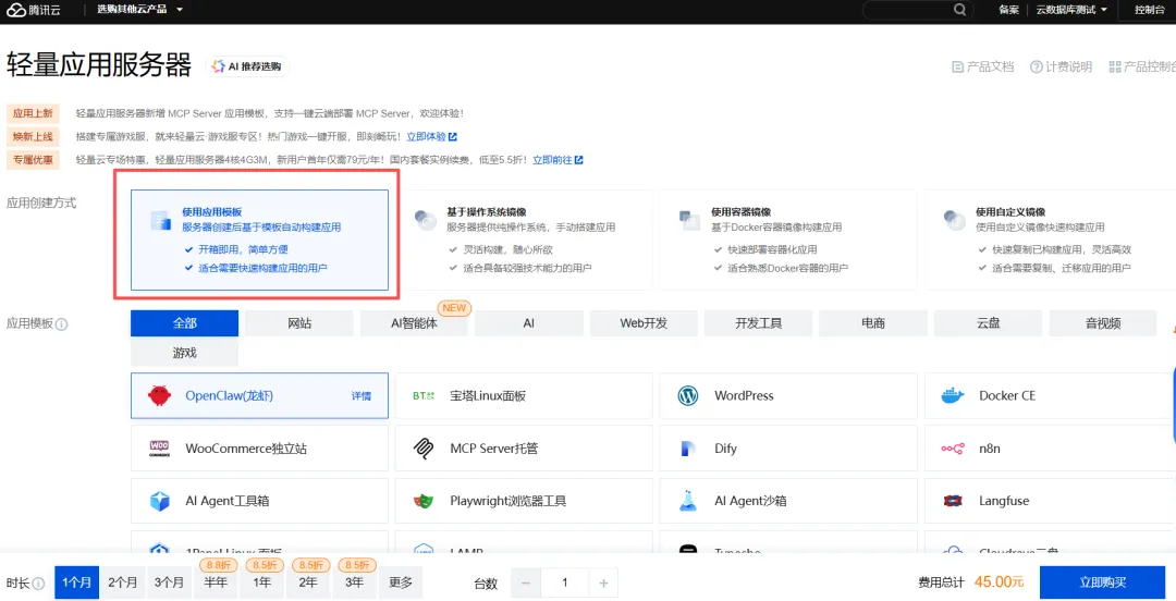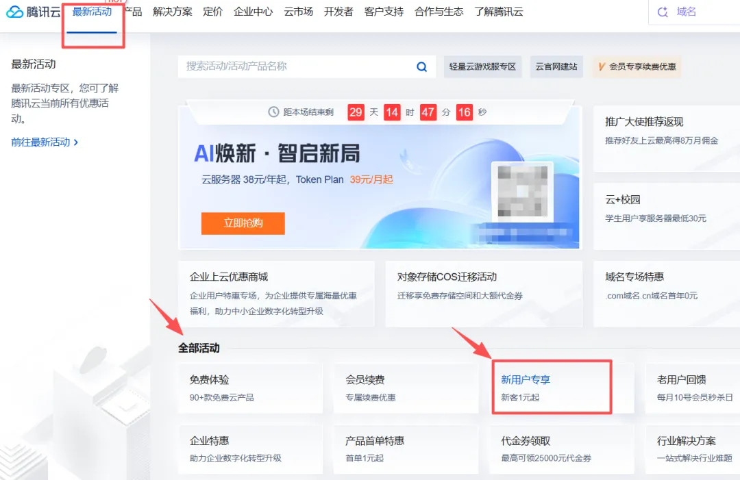 新建实例:腾讯云官网,「最新活动」==》 「新用户专享」或者直接点击文末“阅读原文”跳转到活动页面