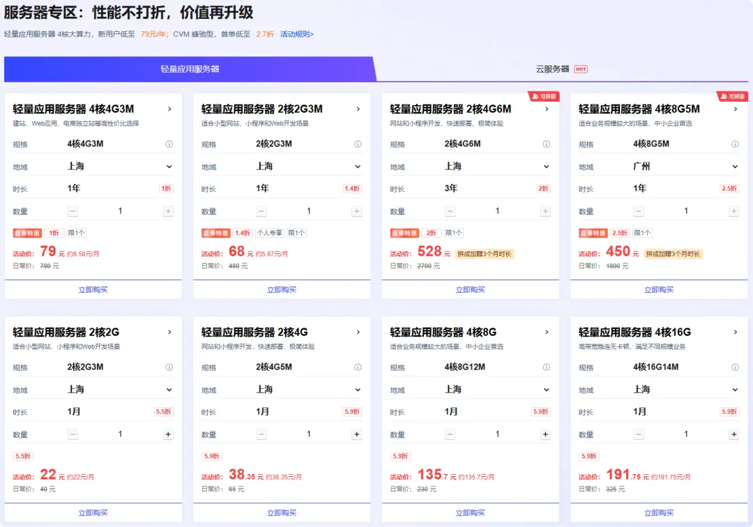 按需购买套餐选择相应的套餐,点击「立即购买」强烈推荐 4核4G,新用户仅需79元一年!