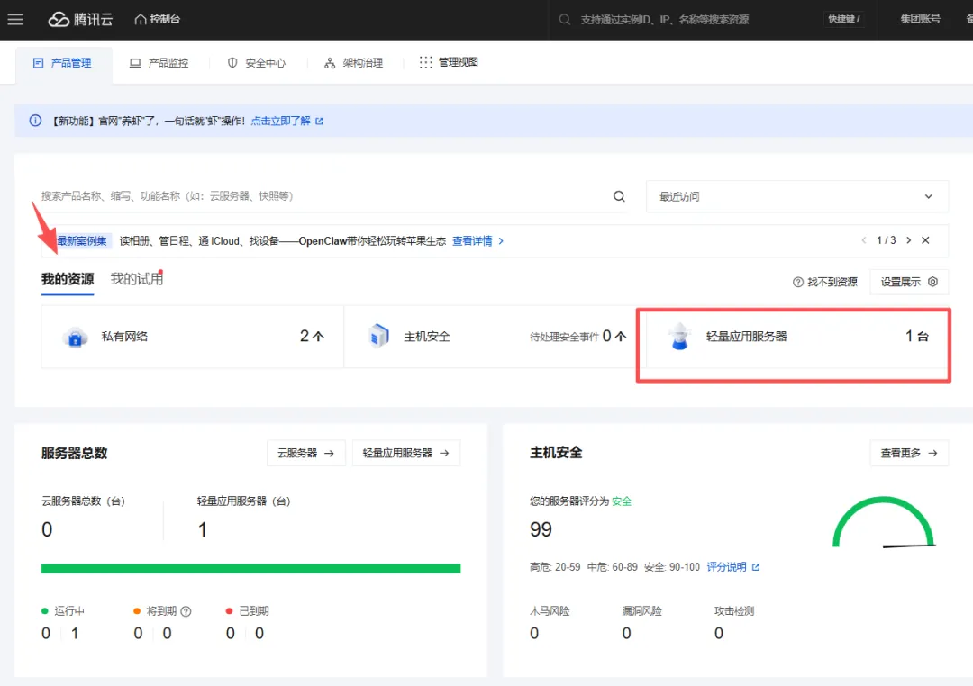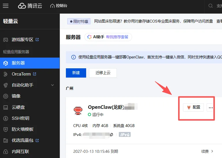 登录控制台操作登录腾讯云控制台 → 我的资源 → 轻量应用服务器→ 配置