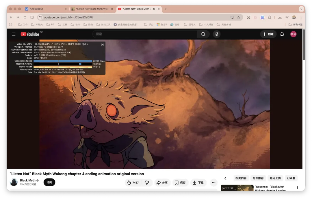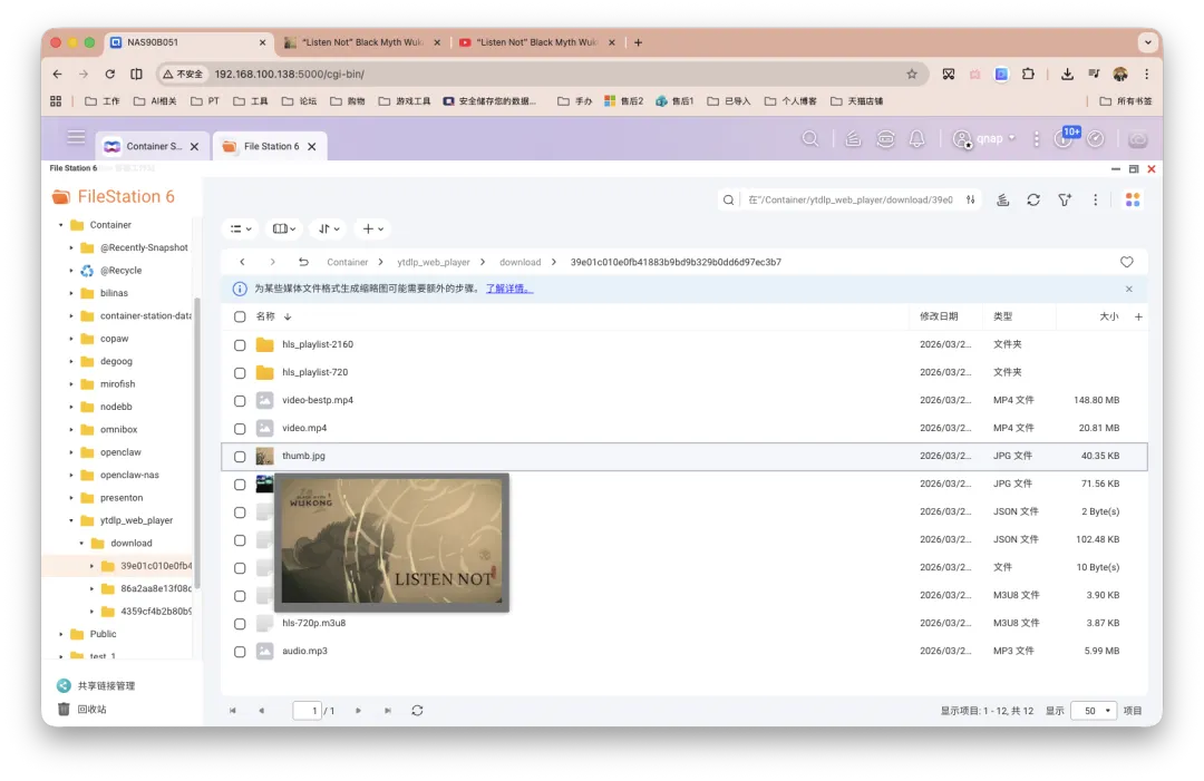 不过需要注意的是,在网页上点击缓存视频会下载到你的本地设备的同时缓存到NAS。其实当你上面点开播放的瞬间,这个视频相关的相关信息便已经down到你的NAS中了。