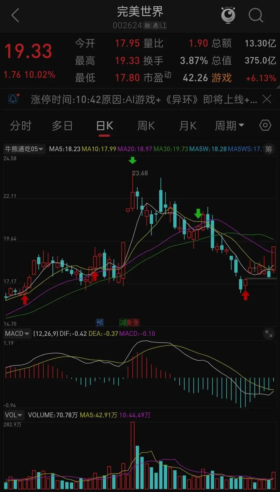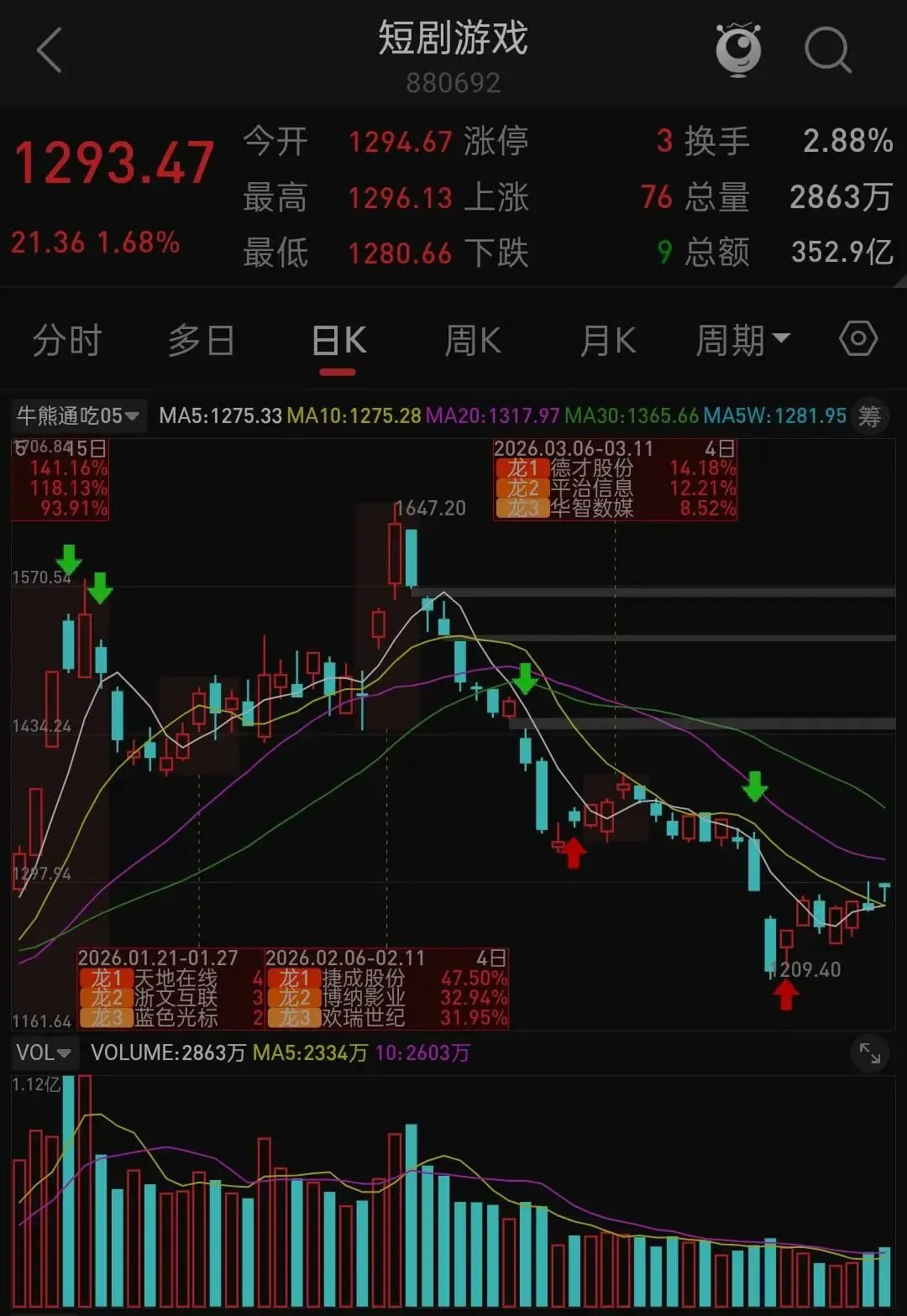 3月24日牛熊通吃手机版指标显示短剧游戏板块出现买入信号,随后几天此板块小幅箱体震荡。女士爱看的抖音短剧视频,导演和制作相当专业,剧情反转很快,成本相当低廉。年轻男士爱玩游戏,这一赛道值得关注。
