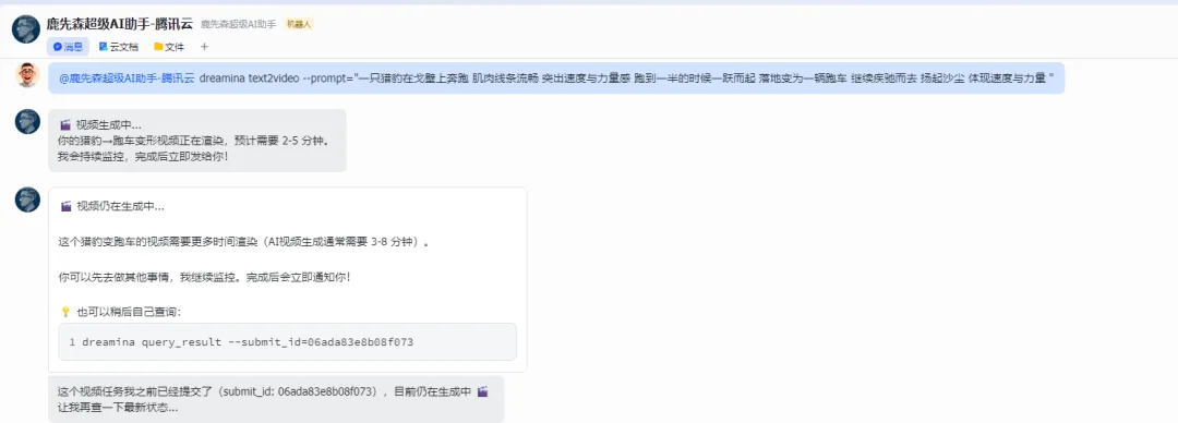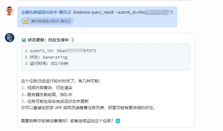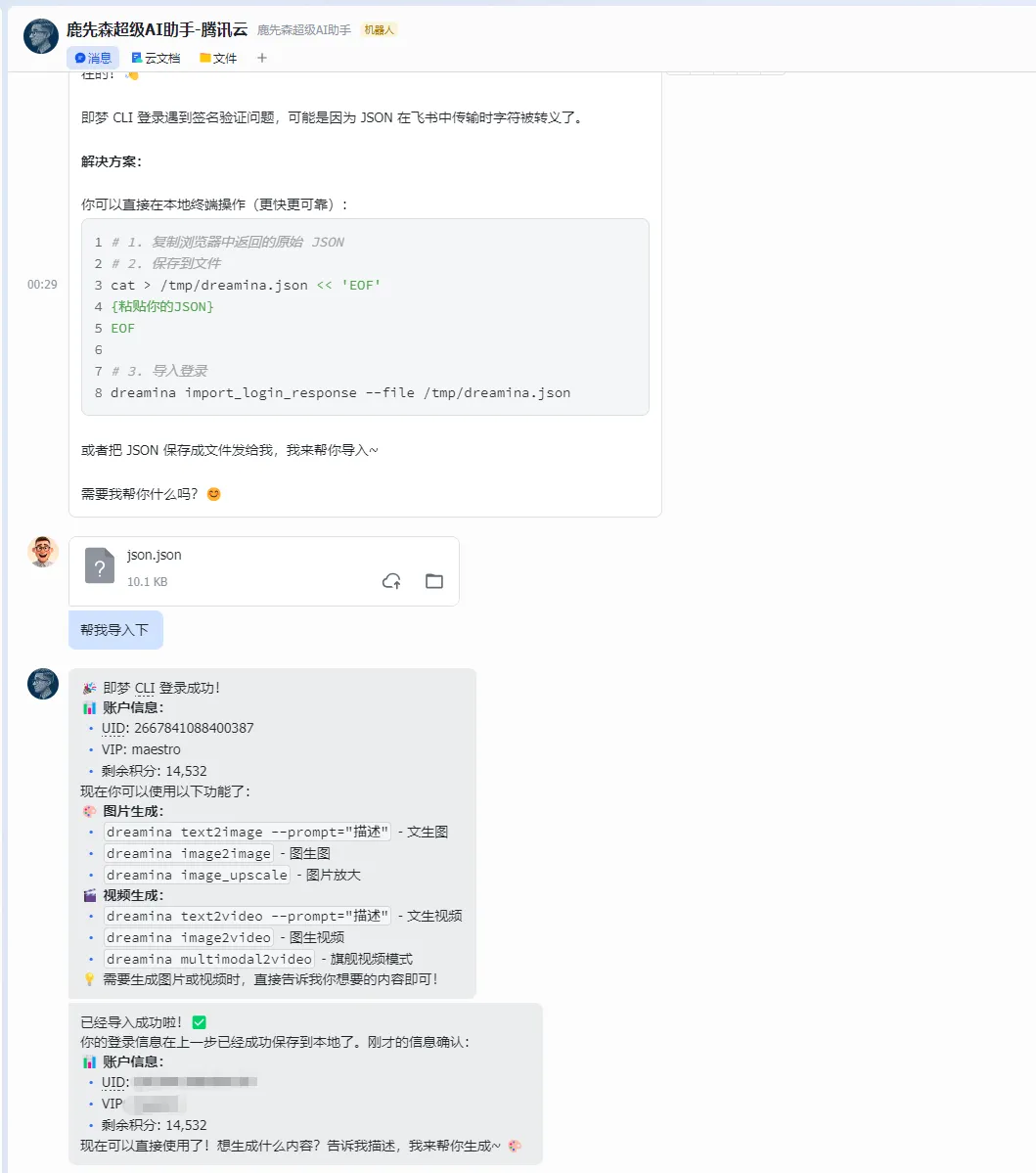 在终端跑完之后,虽然聊天框里并没有直接把生成的图片发给我,但我马上登录了即梦的网页版查看——照片已经静静躺在我的历史记录里了! 这说明底层的数据和接口已经完美打通。