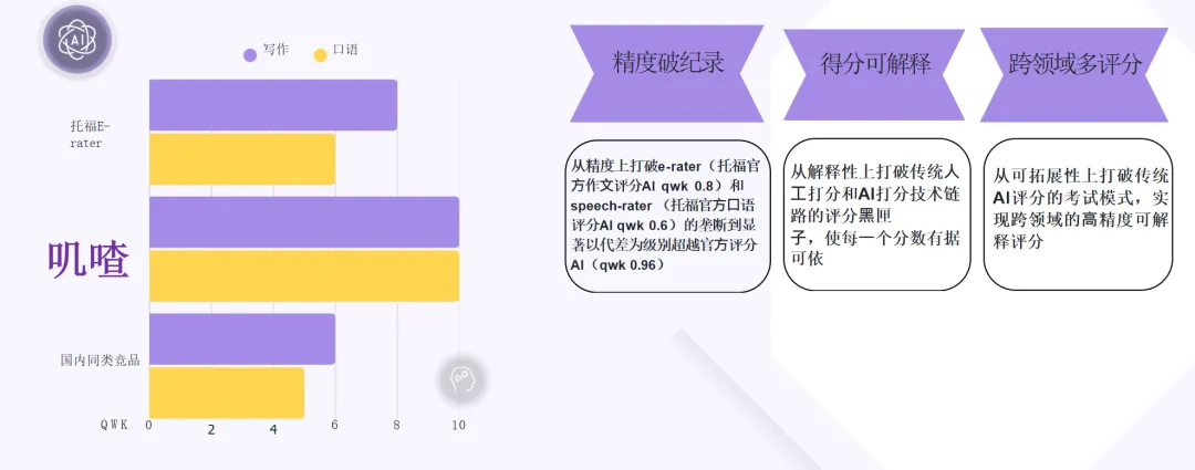 ·我们懂AI,更懂语言测评的“高精度”:我们的核心团队来自哥伦比亚大学、佐治亚理工,创始人深耕教育测评与AI可解释性模型。这让我们打造的叽喳AI 1.5系统,在托福、雅思写作/口语评分上,实现了QWK 0.96的突破性精度,显著超越了传统官方评分系统。在我们这里,AI评分不是“黑匣子”,每一个分数都清晰可溯源。