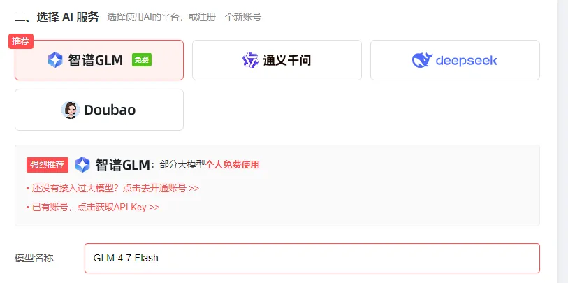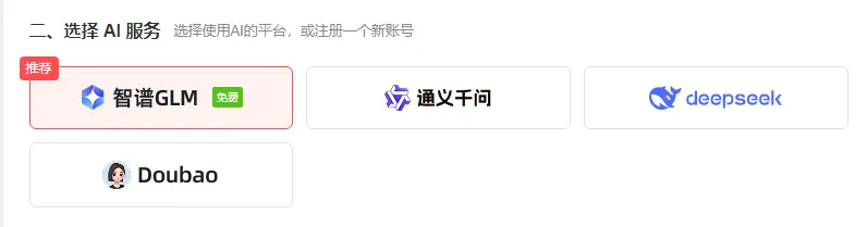 3、选择AI服务,有提供智谱、通义千问、DeepSeek及豆包这4个平台可选。