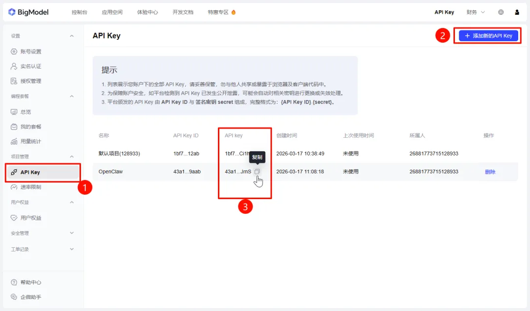 智谱:进入“智谱AI开放平台”并完成登录,选中页面右上角的「API Key」再点击“添加新的API Key”,自定义名称后复制对应的API Key即可。