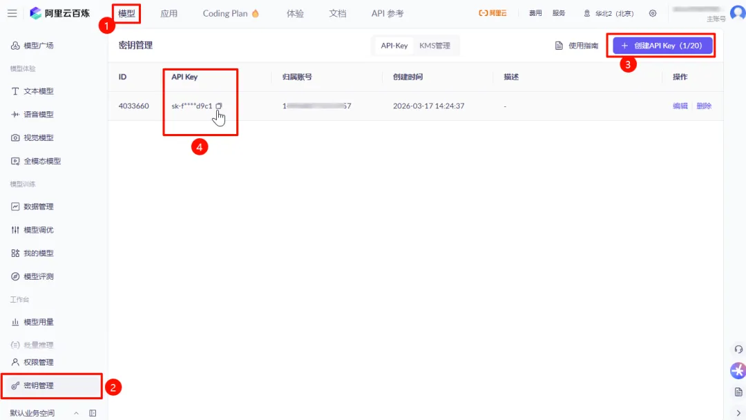 千问:登录“阿里云百炼平台”,接着点击“模型”并选择位于界面左侧的“密钥管理”,然后点击“创建API Key”,选择归属账号完成创建后直接复制API Key。
