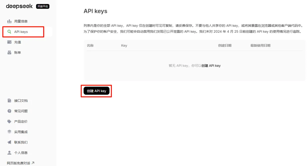 DeepSeek:访问“DeepSeek开放平台”后登录账号,接着进入到“API keys”界面并点击“创建”按钮,填写好名称后直接复制密钥即可。